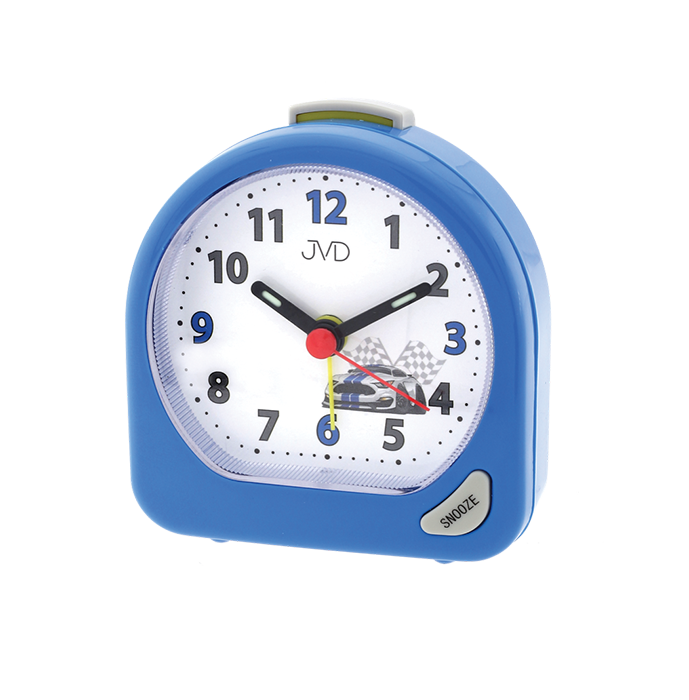 Dětský modrý ručkový budík JVD SR672.5 pro malé závodníky s autemSkladem249 Kč/ ks
